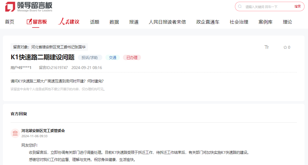 河北雄安新區(qū)黨工委管委會(huì):網(wǎng)友您好!收到留言后,立即協(xié)調(diào)有關(guān)部門(mén)進(jìn)行調(diào)查處理。目前K1快速路受限于拆遷工作,待拆遷工作結(jié)束后,有關(guān)部門(mén)將加快實(shí)施K1快速路的建設(shè)。感謝您對(duì)我們工作的監(jiān)督、理解與支持。祝您身體健康,生活愉快。